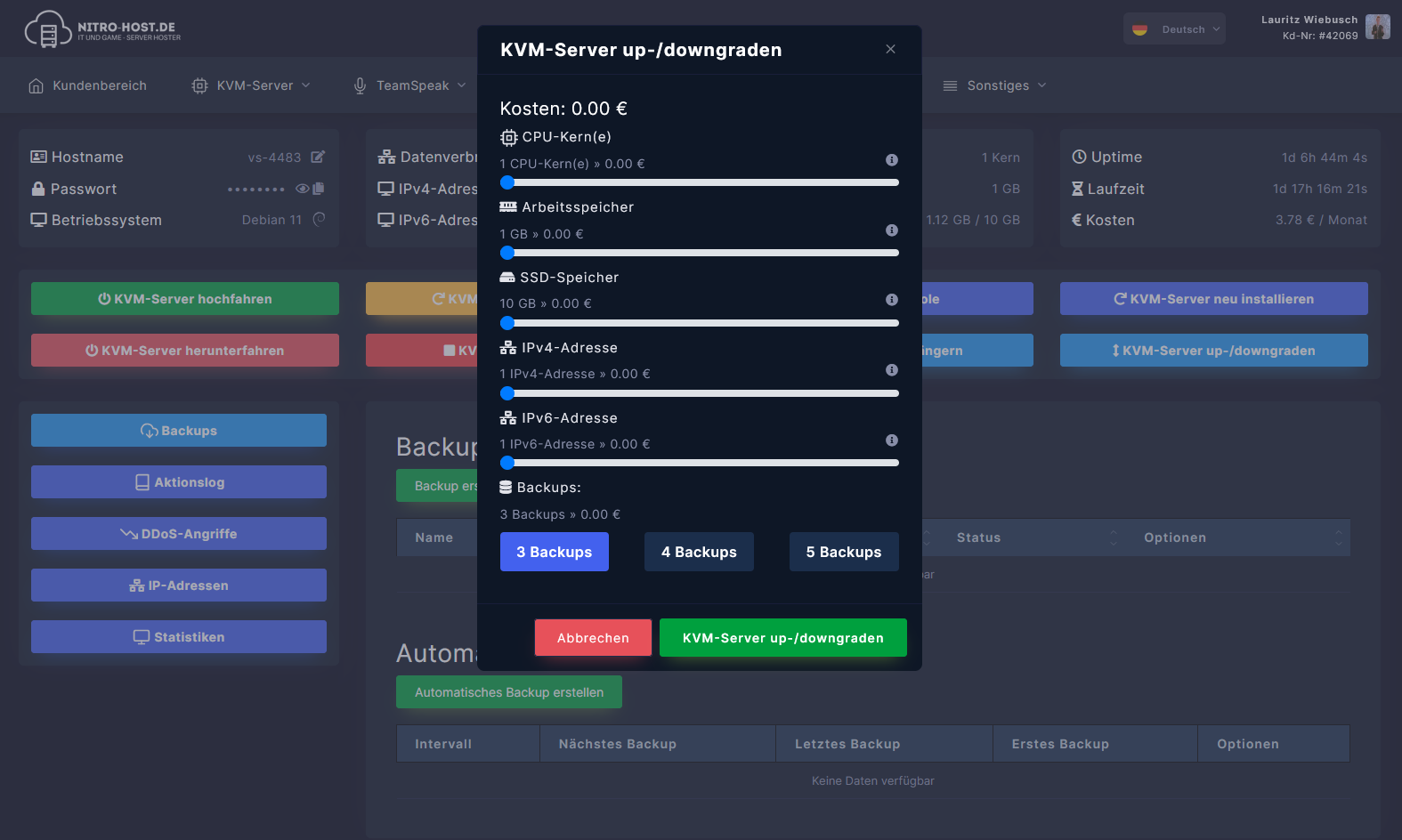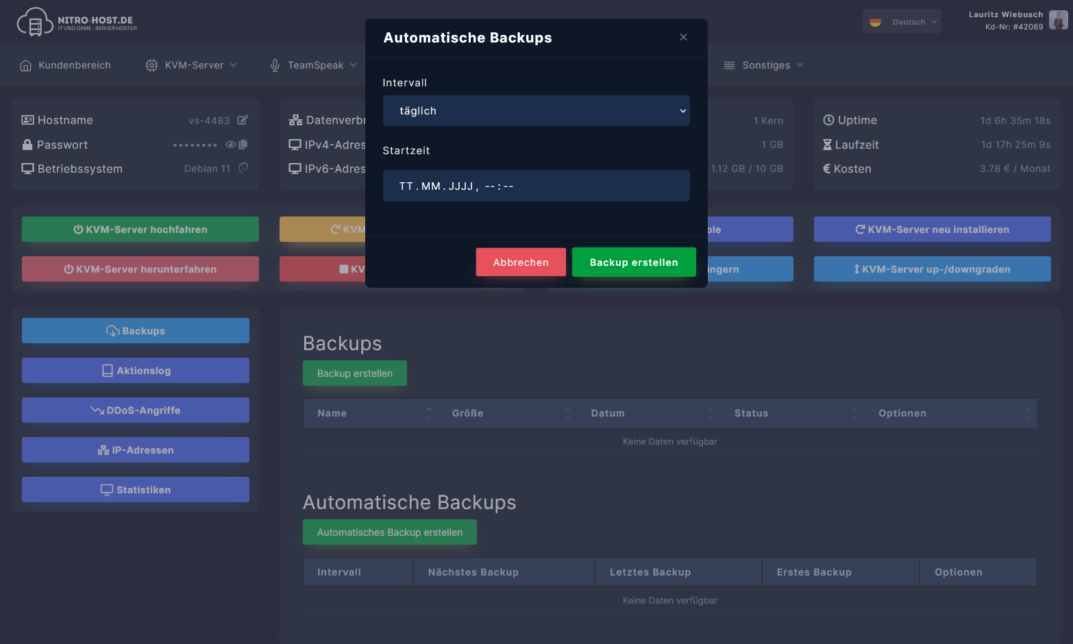 Öffne dein KVM-Server-Dashboard und scrolle nach unten. Dort kannst du auf "Automatisches Backup erstellen" klicken und alles einstellen, was du brauchst.