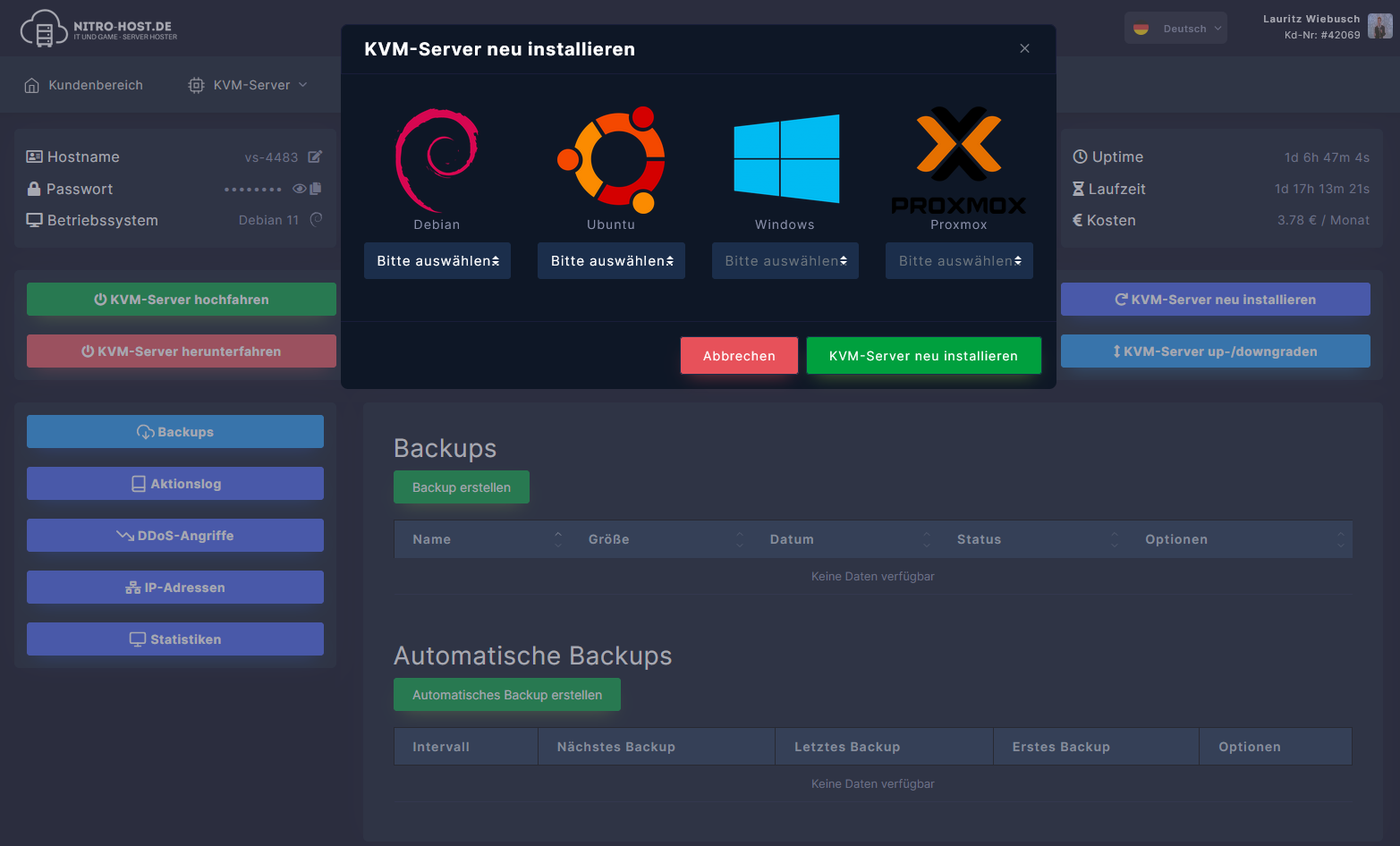 Öffne dein KVM-Server-Dashboard. Dort kannst du auf "KVM-Server neu installieren" klicken. Dort kannst du ein neues Betriebssystem auswählen.